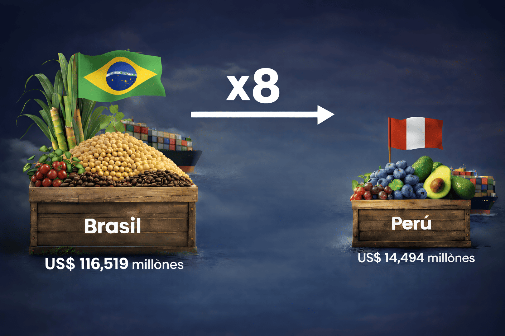 Según Fresh Fruit, Brasil exportó US$ 116,519 millones en 2025, en comparación con US$ 14,494 millones del Perú; una canasta concentrada en soya, café y azúcar, y un destino ancla: China.