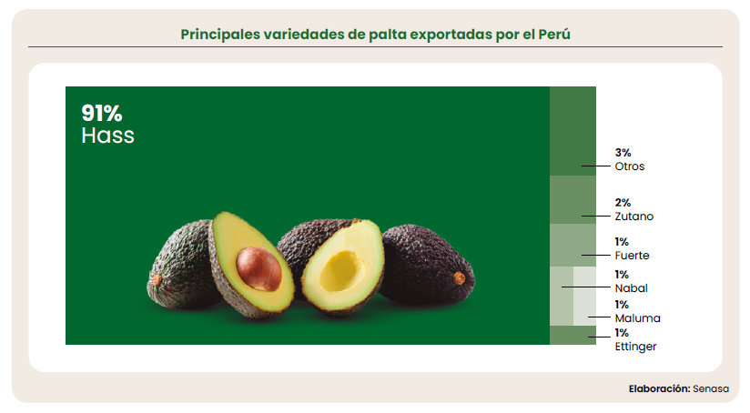 De otro lado, el caso de la palta evidencia la alta vulnerabilidad de una diversificación limitada debido a la fuerte presencia de variedad Hass en el comercio mundial. La producción peruana para exportación se concentra casi por completo en la palta Hass, con una ventana de cosecha definida que restringe las opciones comerciales. Esta dependencia ha dejado al sector expuesto a una drástica caída de precios frente al aumento de la oferta global y la saturación de mercados clave.