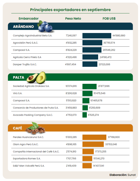 En ese mes, el arándano encabezó las exportaciones, aportando cerca del 32% del valor total; le siguieron el café, impulsado por los precios y con casi 20% de participación; y la palta, en etapa de cierre de campaña, con alrededor del 8%.