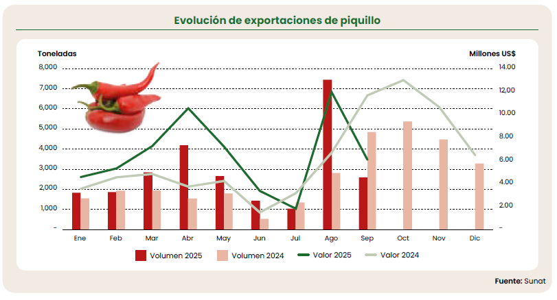 En cuanto al desempeño del 2025 (hasta septiembre), el sector ha mostrado una sólida recuperación tras un 2024 a la baja —que cerró con 18,605 toneladas y US$ 41.9 millones—. Las exportaciones totales de piquillo peruano alcanzaron 25,866 toneladas por un valor FOB de US$ 58 millones, lo que representa un crecimiento del 42% en volumen y del 32% en valor respecto del mismo periodo del año anterior. Sin embargo, este aumento no se reflejó en los precios, que disminuyeron un 6%, situándose el promedio en US$ 2.24 por kilogramo.