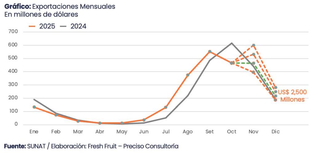 Para ese periodo, las cifras preliminares de la consultora Fresh Fruit muestran que los envíos sumaron 298,883 toneladas por US$ 1,819 millones, un avance de 29% en volumen y 6% en valor frente al mismo tramo del 2024. El precio cerró en US$ 6.09/kg, 18% por debajo del año previo. Octubre, el mes más intenso de la campaña, retrató la dinámica del año: US$ 465 millones (99,509 toneladas) a US$ 4.68/kg, frente a US$ 615 millones (98,835 toneladas) y US$ 6.22/kg de octubre del 2024. La brecha en valor exportado responde a un entorno de mayor oferta en siete de los diez meses.