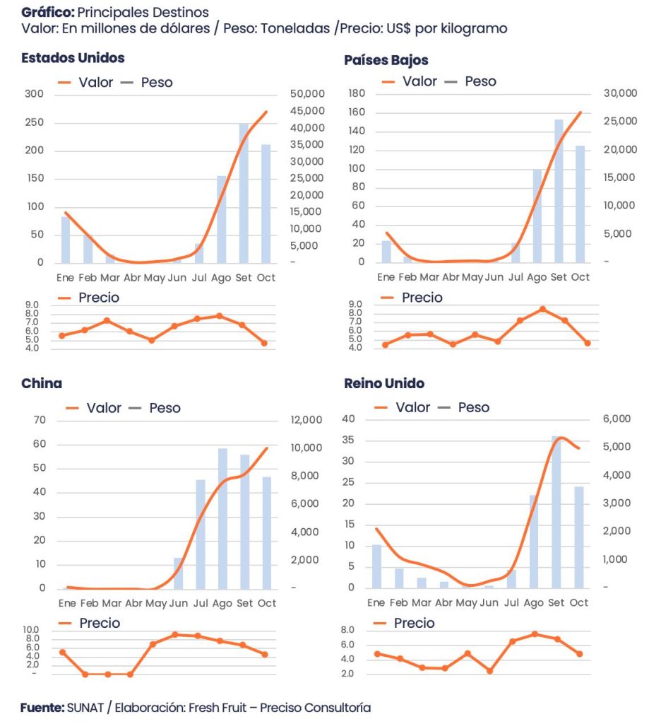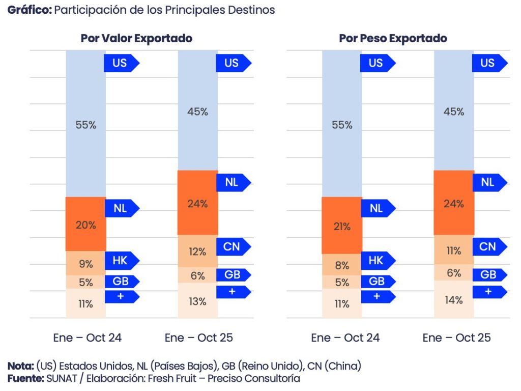 De los 167 destinos alcanzados, Estados Unidos se mantuvo como el principal destino, aunque redujo su participación del 55% al 45% del valor exportado en enero y octubre (US$ 821 millones), con 134,635 toneladas y un precio de US$ 6.10/kg. Los Países Bajos representó 24% (US$ 438 millones), con 70,526 toneladas y precio de US$ 6.21/kg. China pasó del quinto al tercer destino al más que triplicar sus volúmenes frente al mismo periodo del 2024, hasta 32,706 toneladas, con ello alcanzó 12% del valor exportado (US$ 221 millones) y un precio de US$ 6.76/kg. Reino Unido sumo 6% (US$ 108 millones), 19,063 mil toneladas y precio de US$ 5.67/kg. En conjunto, estos cuatro mercados concentraron 87% del valor y 86% del volumen exportado.