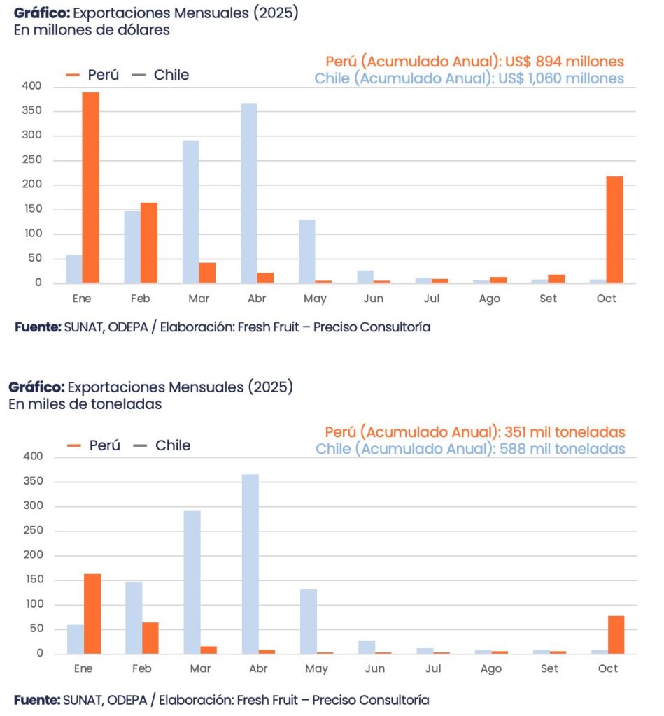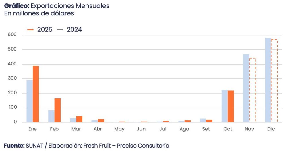 El cierre del año calendario, octubre a diciembre, define la curva de entrada de la campaña productiva 2025/2026. La consultora de inteligencia comercial Fresh Fruit estima que se alcanzaría de 740 a780 mil toneladas y US$ 1.85 a 1.95 mil millones.