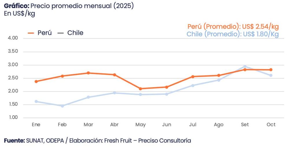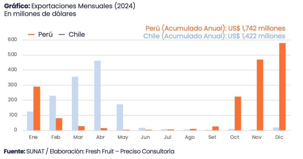 En 2024, el Perú exportó US$ 1,742 millones en uva de mesa, con 594,100 toneladas y un precio promedio de US$ 2.93/kg. Chile, por su parte, registró US$ 1,422 millones y 559,838 toneladas, a un precio de US$ 2.54/kg. En el caso chileno, el 98% del valor y del volumen se embarca entre enero y octubre, lo que concentra prácticamente todo su desempeño anual en ese tramo.