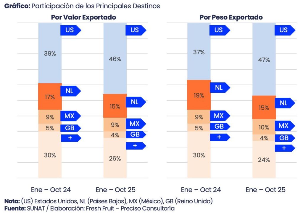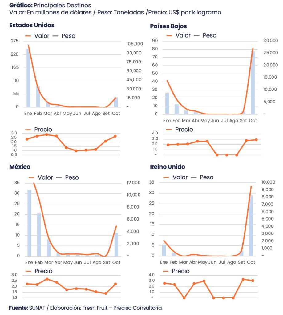 Con el reinicio de cortes en octubre del 2025, Piura, Lambayeque y La Libertad volvieron a marcar el paso, con programas de retail que privilegiaron calibre y consistencia de firmeza. El resultado fue un arranque con volumen sólido y precios contenidos, típico de ventanas con mayor coincidencia de oferta. En octubre se registraron US$ 219 millones y 77,444 toneladas (US$ 2.82/kg), una variación interanual de -3% en valor, +2% en volumen y -4% en precio.