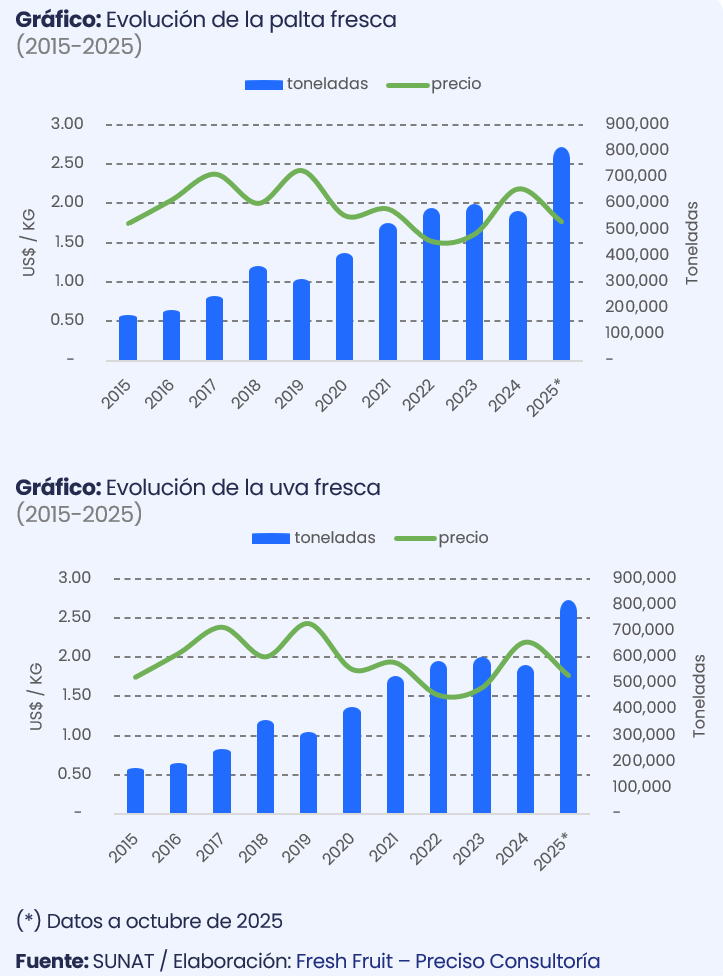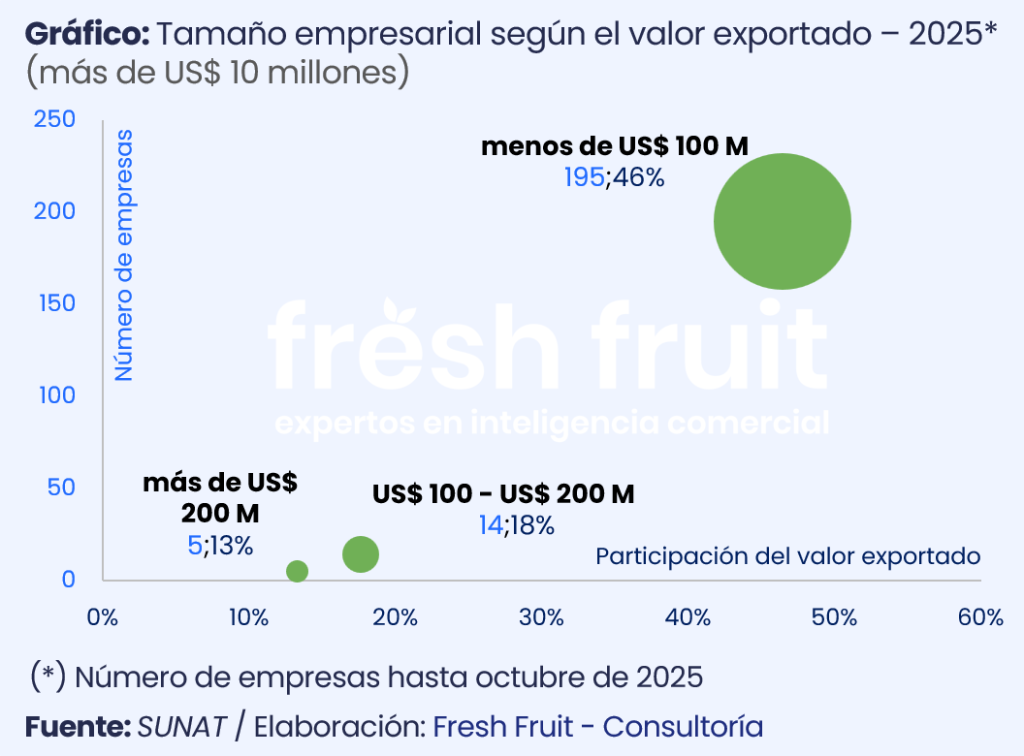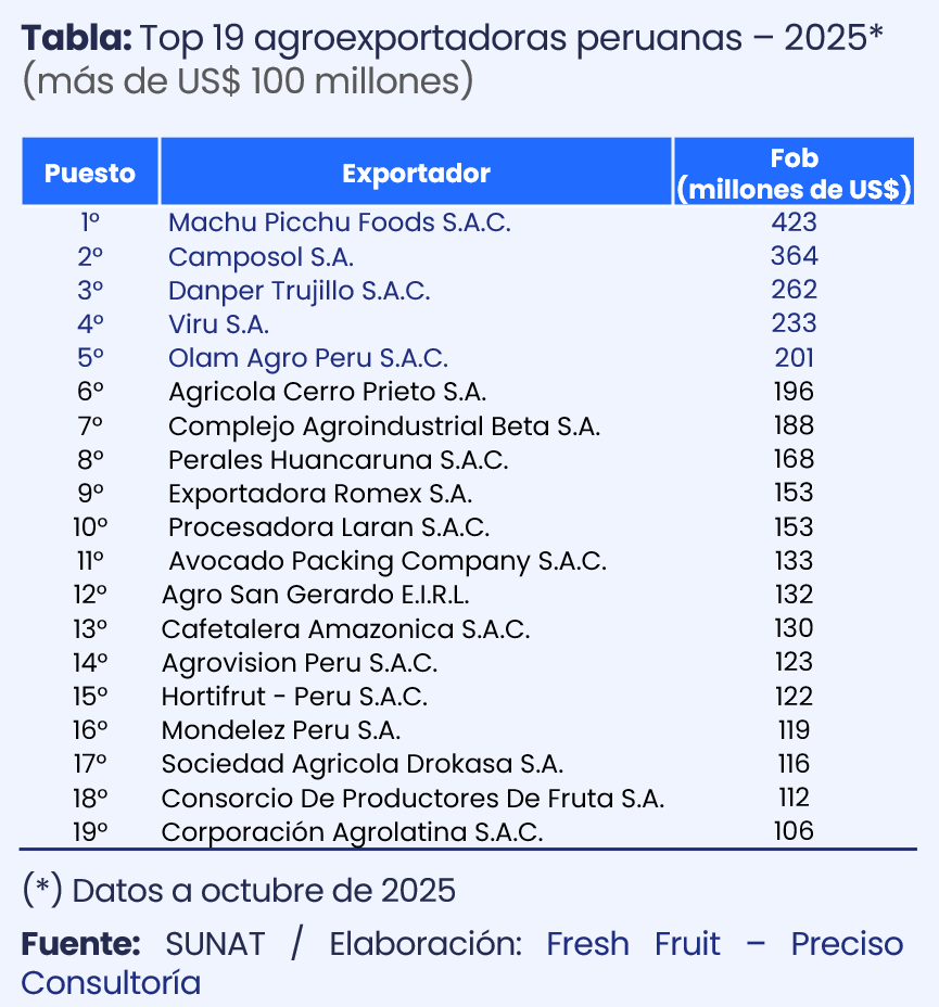 Según Fresh Fruit, al analizar las empresas más grandes del sector agroexportador del Perú, las grandes agroexportadoras peruanas marcan la ruta abriendo mercados y haciendo que el mundo conozca los productos peruanos. El crecimiento de las agroexportaciones generó que en el periodo enero-octubre del 2025, 19 empresas superaron los US$ 100 millones en envíos, tres más que en el 2024; y cinco lograron sobrepasar los US$ 200 millones, una compañía más que el año pasado. En conjunto, estas últimas cinco empresas concentraron alrededor del 13% del valor total exportado por el agro peruano entre enero y octubre del 2025.