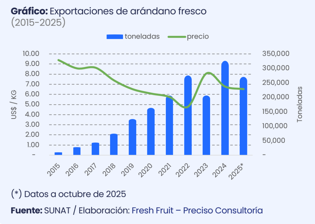 En el caso del arándano fresco, el precio promedio rondó los US$ 6.52 por kilogramo, 4% por debajo del 2024. Pese a ello, algunas empresas lograron posicionarse por encima del mercado. Entre ellas, Camposol S.A., Agrícola Cerro Prieto S.A. y Danper Trujillo S.A.C. alcanzaron las mejores cotizaciones, con precios de US$ 6.55, US$ 7.48 y US$ 6.95, respectivamente, gracias a una mayor proporción de fruta premium y mejores condiciones logísticas hacia Estados Unidos y Europa. Asimismo, Family Farms Perú S.R.L. obtuvo uno de los precios más altos del año (US$ 8.60/kg), con ventas por US$ 56 millones, mientras que Hortifrut – Perú S.A.C., pese a competir con precios más bajos (US$ 4.72/kg), logró despachos por US$ 122 millones en el mismo periodo.