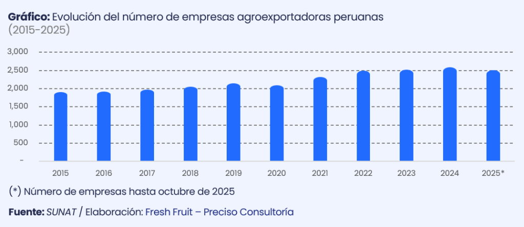 De acuerdo con estimaciones de la consultora Fresh Fruit, entre enero y octubre, más de 2,500 compañías participaron en el comercio exterior agrícola peruano, casi 80 más que en el mismo periodo del 2024. De ellas, alrededor de 789 ya superaron el millón de dólares exportado, reflejando la expansión y madurez de un sector que sigue sumando actores y fortaleciendo su estructura productiva.