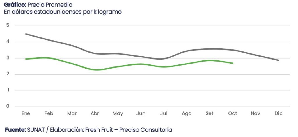 El precio continúa siendo el principal reto. Durante el 2024, el precio disminuyó de US$ 4.49/kg en enero a US$ 2.87/kg en diciembre. Lejos de revertirse, en el 2025 la tendencia se mantuvo. Entre enero y octubre el precio promedio se mantuvo en niveles cercanos a los US$ 2.60/kg, alcanzando su punto más bajo en abril (US$ 2.28/kg).