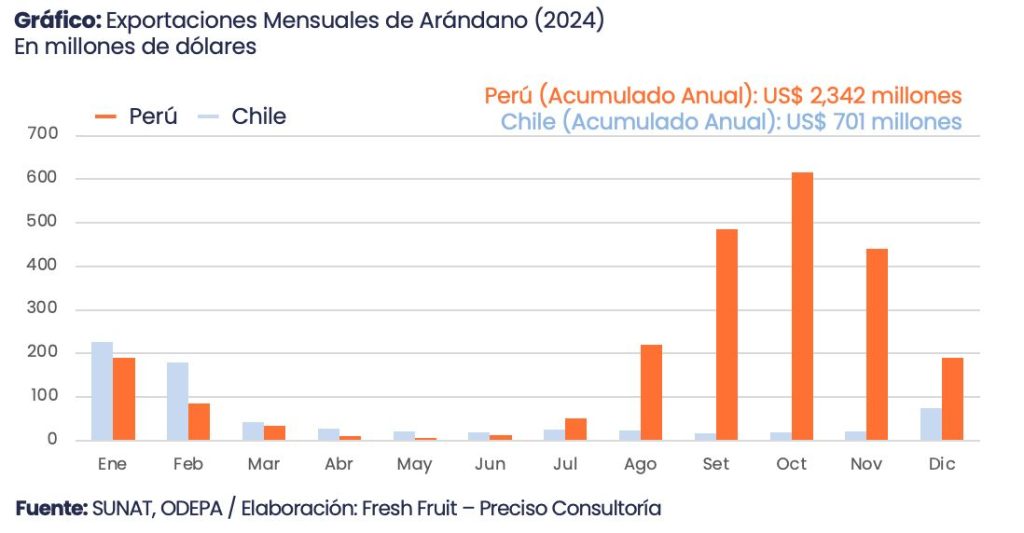 El segundo eje —y quizá el más relevante para los próximos años— es la complementariedad temporal y de portafolio. En arándanos, por ejemplo, las ventanas comerciales se encadenan: Chile concentra sus envíos entre diciembre y mayo, mientras Perú carga la parte más pesada de la campaña de agosto a enero.