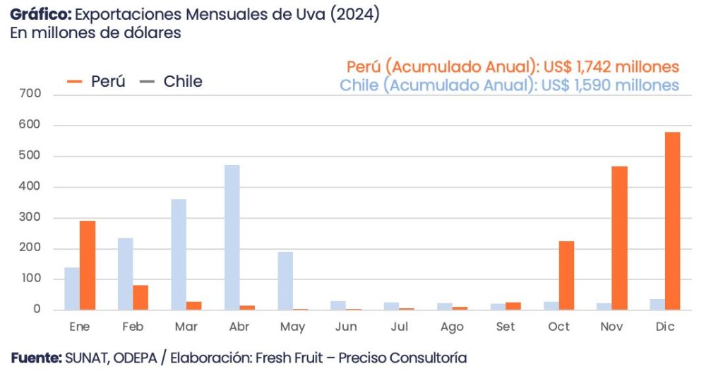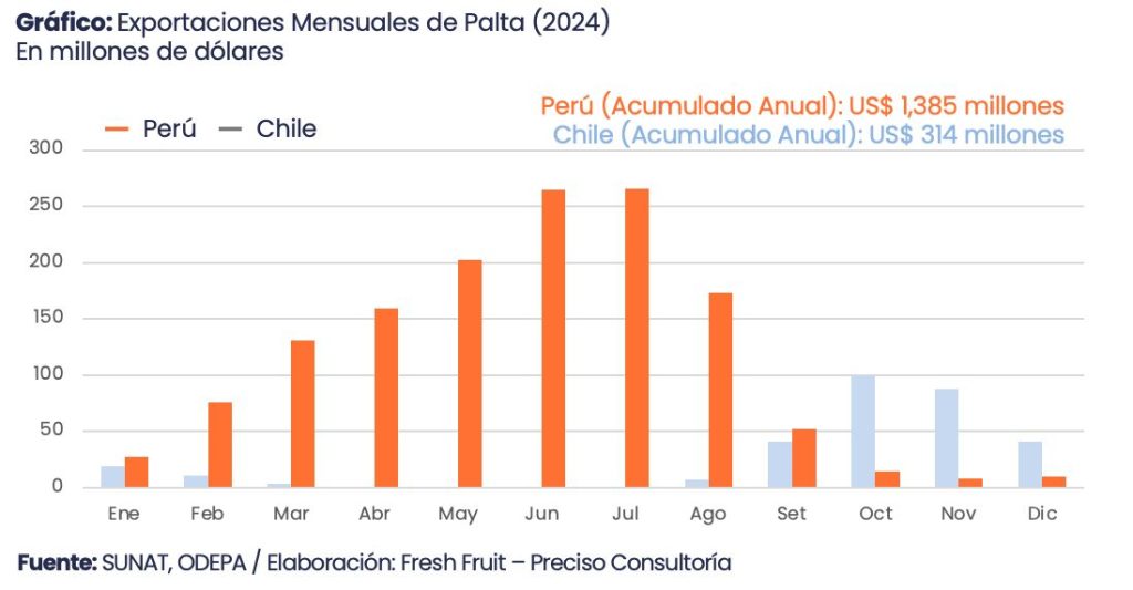 Algo similar ocurre con la uva y la palta. En la uva, cerca del 90% de los embarques peruanos se lleva a cabo entre octubre y enero, mientras que alrededor del 88% de los envíos chilenos se concentra entre enero y mayo; respecto de la palta, aproximadamente el 93% de los envíos peruanos se da entre febrero y agosto.