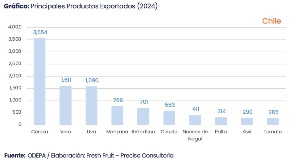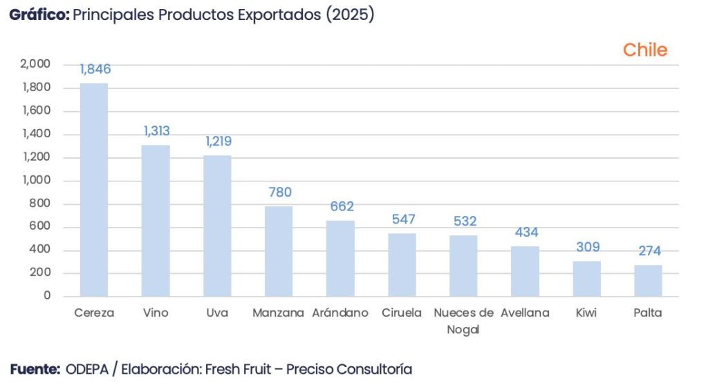 En Chile, el listado de los diez principales productos agrícolas exportados al mundo dibuja un perfil distinto. El liderazgo recae en la cereza, que en pocos años se ha convertido en uno de los íconos de la fruticultura mundial, fuertemente orientada a Asia y, en particular, al mercado chino. La cereza chilena es un ejemplo de especialización extrema en un producto de muy alto valor, concentrado en pocas semanas de campaña, con exigencias logísticas y de financiamiento considerables.
