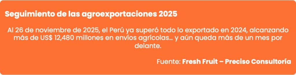 Según la consultora de inteligencia comercial Fresh Fruit, las exportaciones agrícolas acumuladas del Perú ya superaron a las de Chile entre enero y octubre del 2025, con meses todavía clave por delante: arándano y uva en el caso peruano, y la campaña de cereza de diciembre para Chile. Ambos llegan a fines de año con niveles de exportación muy similares tras una década de fuerte expansión basada, sobre todo, en fruta y agroindustria.