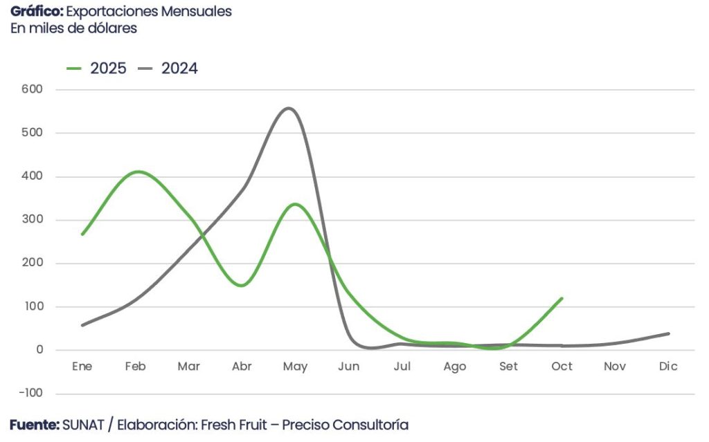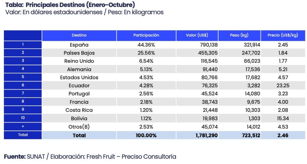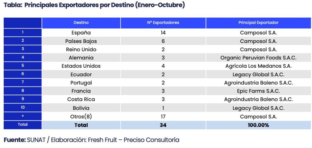 Entre las principales exportadoras por valor acumulado de enero a octubre del 2025, Camposol S.A. se posicionó como el principal exportador, con un valor de US$ 697,947 y una participación del 39.2%. Le siguió Agroindustria Baleno S.A.C., con US$ 205,719 y el 11.5% de participación; finalmente, Titan Fruit Import & Export S.A.C., con US$ 175,629, representando el 9.9% del valor exportado.