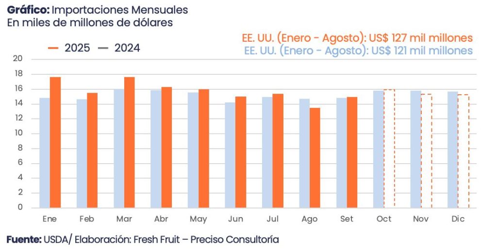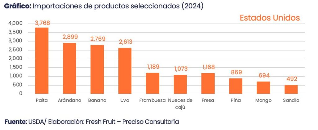 Según Fresh Fruit, Estados Unidos se ha consolidado como un gran comprador de alimentos del mundo que viene ampliando su relación con proveedores externos. Con compras por US$ 183 mil millones el año 2024, el mercado de Estados Unidos ofrece amplio espacio para el Perú, que se posiciona como el octavo proveedor agrícola.