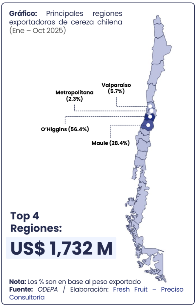 Este aumento también se reflejó en la geografía productiva. Las regiones de O’Higgins, Maule y Valparaíso concentraron la gran mayoría de la oferta exportable. O’Higgins explicó el 56% del peso total enviado; Maule aportó el 28%; y Valparaíso el 6%. Estas zonas destacan por su tradición frutícola, con infraestructura desarrollada y acceso a mano de obra especializada, pero sobre todo, el factor fundamental es un clima muy favorable para este cultivo.