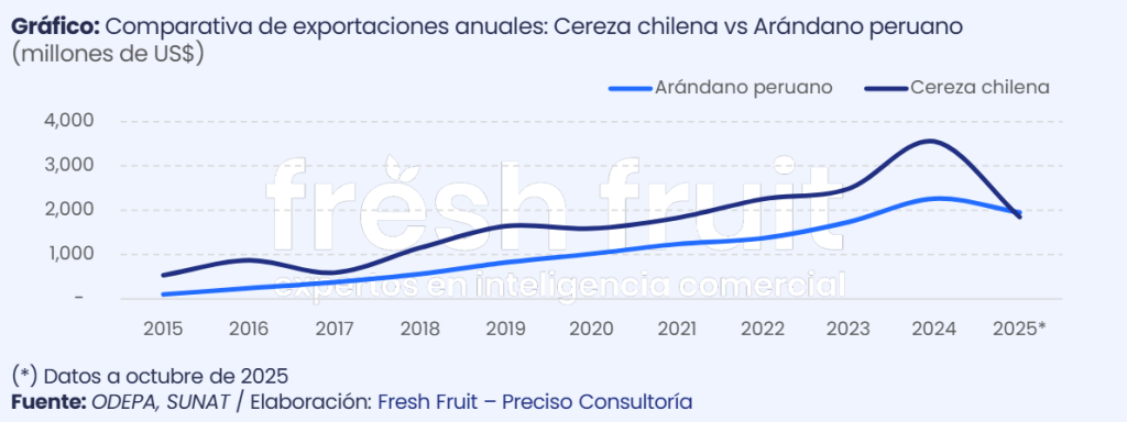 Estas diferencias explican por qué el Perú pudo escalar el arándano con rapidez, incluso superando la barrera de los US$ 1,000 millones en el 2020, pese a producirlo en zonas cálidas y cercanas al nivel del mar. En cambio, en Chile la cereza alcanzó ese mismo hito en el 2018, pero apoyándose en un clima templado-frío imposible de replicar en la costa peruana. Ambos cultivos comparten una velocidad de crecimiento extraordinaria —los dos pasaron de exportar entre US$ 10 y 20 millones a superar los US$ 1,000 millones en aproximadamente ocho años—, pero lo hicieron desde realidades climáticas completamente distintas. La cereza chilena prosperó gracias a un invierno frío y estaciones marcadas; el arándano peruano, en cambio, se desarrolló en un clima cálido y sin estaciones, gracias a su enorme capacidad de adaptación y al uso de variedades modernas.