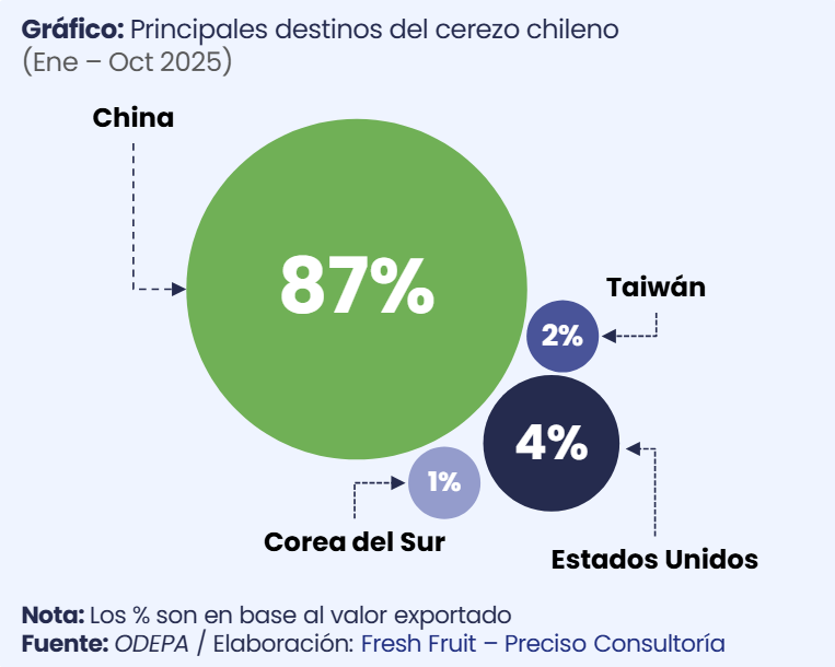 Entre enero y octubre del 2025, los envíos chilenos ya han llegado a 62 países (2 más que todo el 2024), aunque uno domina sin discusión: China. En este periodo, este mercado representó el 87%, con compras equivalente a 402,403 toneladas por US$ 1,614 millones y un precio promedio de US$ 4.01 el kilogramo. La cereza se ha convertido en uno de los productos más simbólicos del consumo festivo chino, especialmente durante el Año Nuevo Lunar, cuando las frutas rojas adquieren un significado cultural asociado a la buena fortuna y a los buenos augurios. Esto explica por qué el pico absoluto de demanda se concentra en enero.