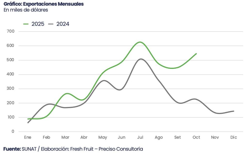 Las exportaciones de aguaymanto peruano mantuvieron un desempeño relevante durante los primeros diez meses del 2025. En el periodo de enero a octubre, los envíos llegaron a US$ 3.7 millones. Esto representó un fuerte incremento interanual del 43.2% en valor respecto a los US$ 2.6 millones exportados en el mismo periodo del año pasado.