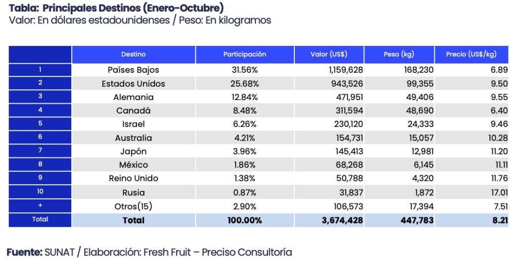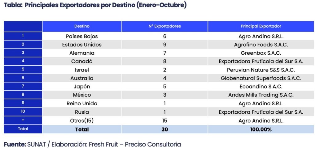 Entre las principales exportadoras por valor acumulado de enero a octubre del 2025, destacaron tres empresas que concentraron casi el 60.0% del valor total. Agro Andino S.R.L. se posicionó como el principal exportador, con un valor de US$ 907,786 y una participación del 24.7%. Le siguieron Exportadora Frutícola del Sur S.A., que alcanzó US$ 652,653 y el 17.8% de participación, y Greenbox S.A.C., con US$ 595,809, representando el 16.2% del valor exportado.