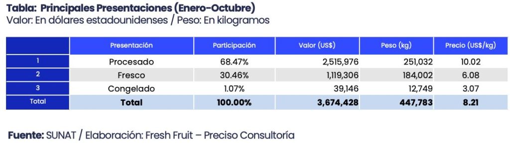Por tipo de presentación, el aguaymanto procesado concentró la mayor participación en valor de lo exportado en el 2025, US$ 2.5 millones, precio promedio de 10.02 US$/kg. La presentación en fresco le siguió en importancia, con US$ 1.1 millones (6.08 US$/kg), y congelado se ubicó en tercer lugar, con US$ 39,146 (3.07 US$/kg).