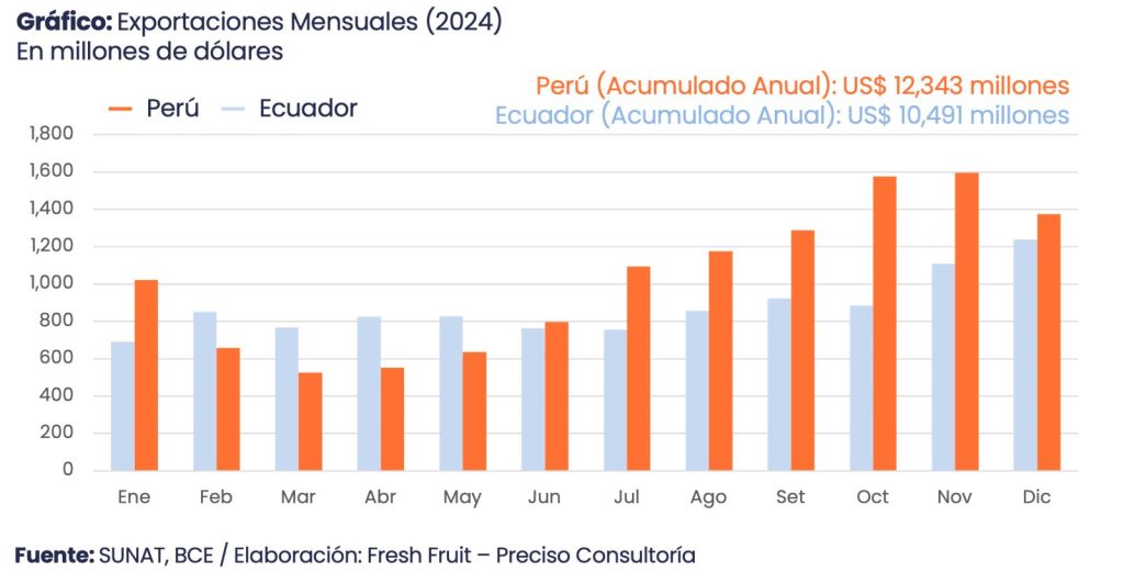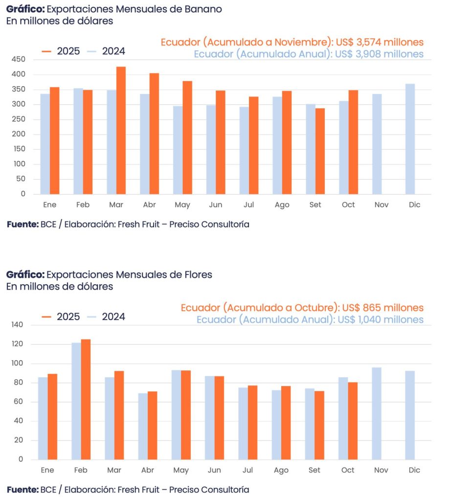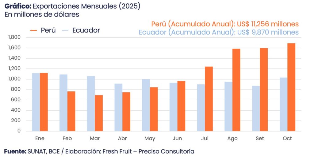 Esa diferencia cambia la forma de leer el año. En Ecuador, entender el ciclo del cacao y el funcionamiento logístico del banano suele ser suficiente para explicar el agregado. En Perú, el desempeño depende más de la coordinación entre calendario agrícola, logística de frío, demanda por producto en mercados específicos y genética e innovación para mantener los productos que el consumidor prefiere. En términos prácticos, el país cambia una dependencia fuerte a un par de motores por una exposición más distribuida, pero con mayores necesidades de coordinación: funcionar como una orquesta sinfónica para que todo salga bien.