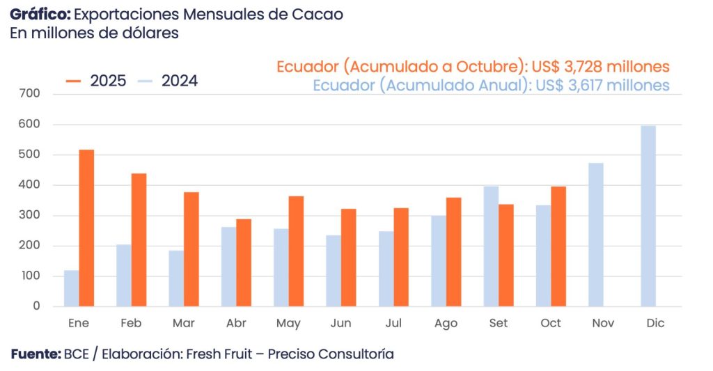 La razón es doble. Primero, el cacao pesa más en el período: US$ 3.7 mil millones entre enero y octubre de 2025 (38% del total), por encima de lo observado en enero–octubre de 2024. Segundo —y más importante para entender el cambio de tono—, el cacao llega en un ciclo de mayores precios y menor oferta internacional.