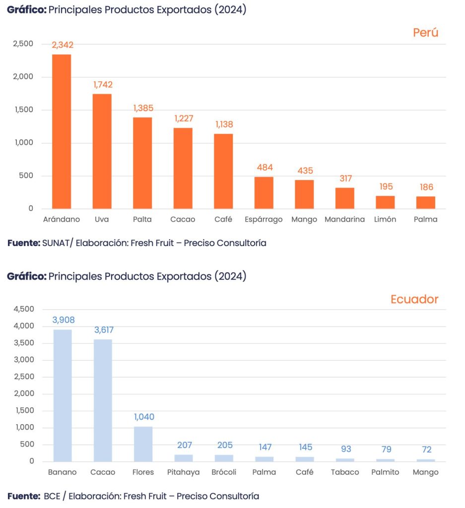 En Perú, el top 10 tiende a confirmar un patrón distinto: liderazgo de frutas de alto valor —con campañas marcadas— y un soporte relevante de café y cacao. A diferencia de Ecuador, donde dos productos organizan gran parte de la lectura, en Perú el resultado se explica por un conjunto más amplio. Esa dispersión permite amortiguar shocks de precio en un rubro específico, pero desplaza el problema hacia la ejecución: una ventana comercial mal sincronizada, un ajuste de fletes o una caída de calidad puede afectar varios productos a la vez.