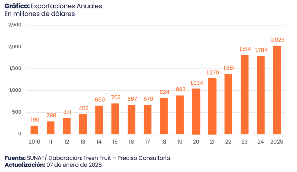 Gracias a ello, se logró que las agroexportaciones del 2025 puedan mostrar, tras solo un año, que pudo romper el récord de los US$ 2 mil millones exportados por arándanos en el 2024. Ahora son dos los productos que superaron ese monto exportado: arándanos y uvas.
