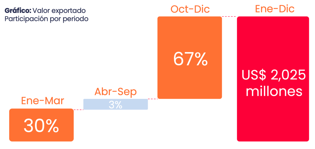 Un dato que resume la estacionalidad: las exportaciones de enero, noviembre y diciembre representaron 75% del valor anual y 75% del volumen en el 2025.