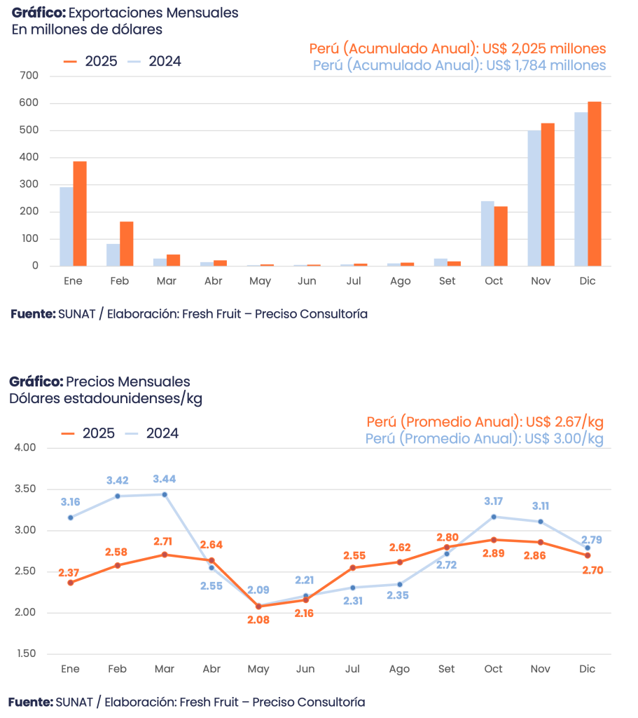 En el acumulado entre los meses de enero y diciembre del 2025, los envíos de uva de Perú sumaron US$ 2,025 millones y 756,545 toneladas, con un precio de US$ 2.67/kg. Frente al mismo periodo del 2024 (US$ 1,784 millones y 593,754 toneladas; US$ 3.00/kg), el resultado implica +13% en valor, +27% en volumen y -11% en precio.