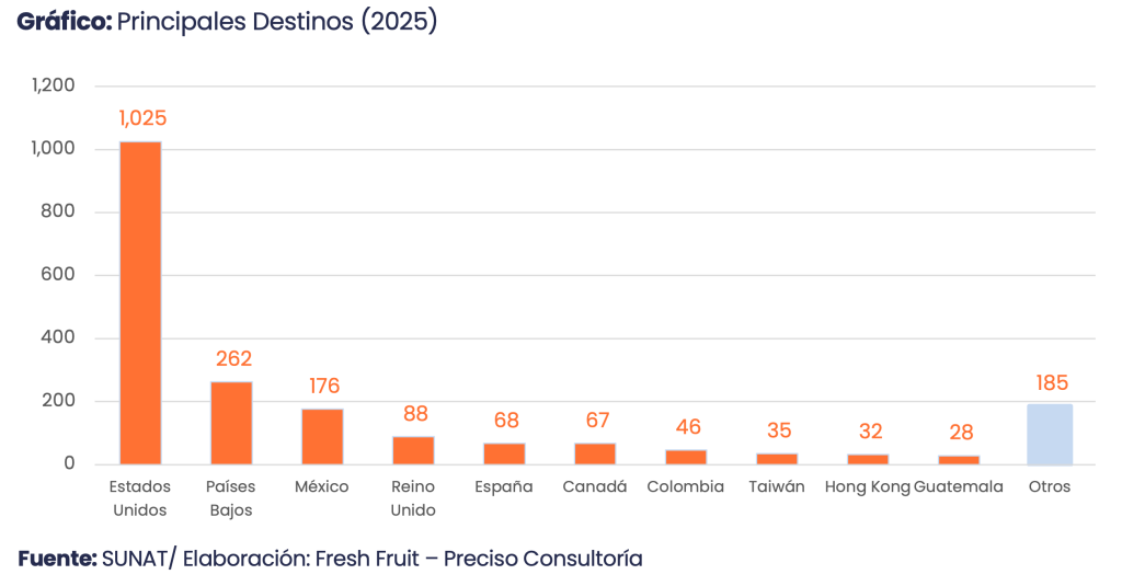En precios, Estados Unidos y Europa siguen anclando el promedio anual que termina recibiendo el exportador peruano. Asia puede pagar más, pero lo hace de forma selectiva y condicionada a desempeño en calibre–firmeza–vida útil.