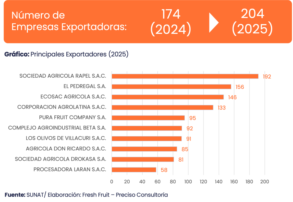 Aun así, el negocio sigue concentrado en la parte alta. El Top 10 sumó US$ 1,129 millones, equivalente a 56% del valor exportado. Y el liderazgo se hace más visible en el Top 5, que acumuló US$ 722 millones (36% del total): Sociedad Agrícola Rapel S.A.C. (US$ 192 millones), El Pedregal S.A. (US$ 156 millones), Ecosac Agrícola S.A.C. (US$ 146 millones), Corporación Agrolatina S.A.C. (US$ 133 millones) y Pura Fruit Company S.A. (US$ 95 millones).