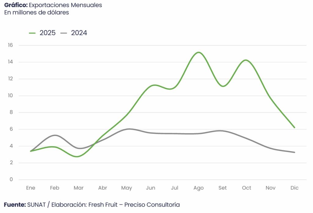 En términos de valor, los envíos alcanzaron US$ 101.6 millones en el 2025, lo que representó un aumento interanual significativo (+77%) frente a los US$ 57.4 millones registrados el año previo. El volumen exportado ascendió a 56.351 toneladas, más del doble de lo observado el año anterior (+120%). Este comportamiento se dio por un fuerte incremento en la cantidad exportada a pesar de un precio promedio menor, que pasó de US$ 2.25/kg a US$ 1.80/kg (−20%).