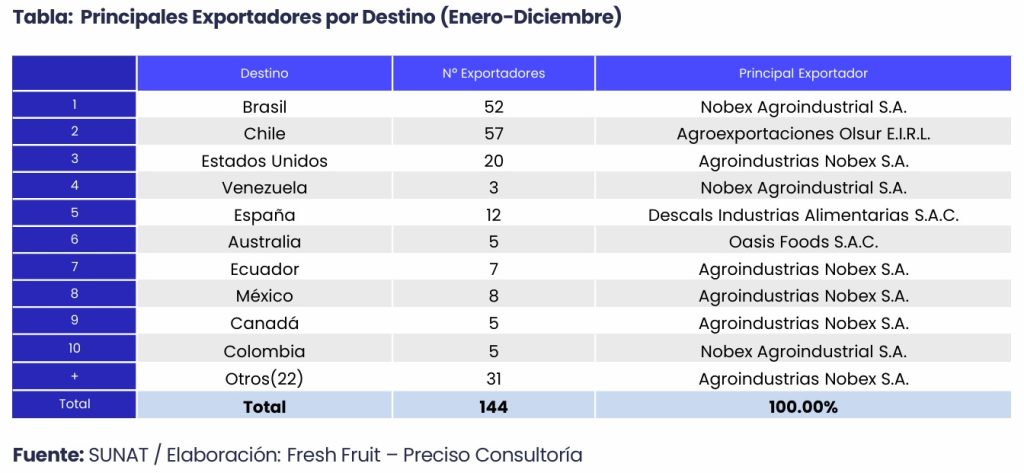 A nivel empresarial, el sector tiene 140 exportadores. Agroindustrias Nobex S.A. encabezó las exportaciones en el 2025 con US$ 15.9 millones, aunque ligeramente por debajo de su nivel de 2024 (−7%). Después, se encontraron, Nobex Agroindustrial S.A., con US$ 12.5 millones —un valor mucho más alto que en el 2024 donde solo exportó US$ 4.4 millones (+183%)— y Fundo La Noria S.A.C., con US$ 8.3 millones —un valor mayor con respecto a los US$ 5.6 millones del año pasado (+49%)—, reflejando una recomposición del ranking empresarial y un mayor dinamismo de operadores que ampliaron de forma notable su participación en el mercado.