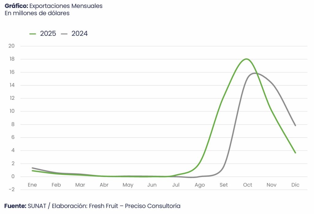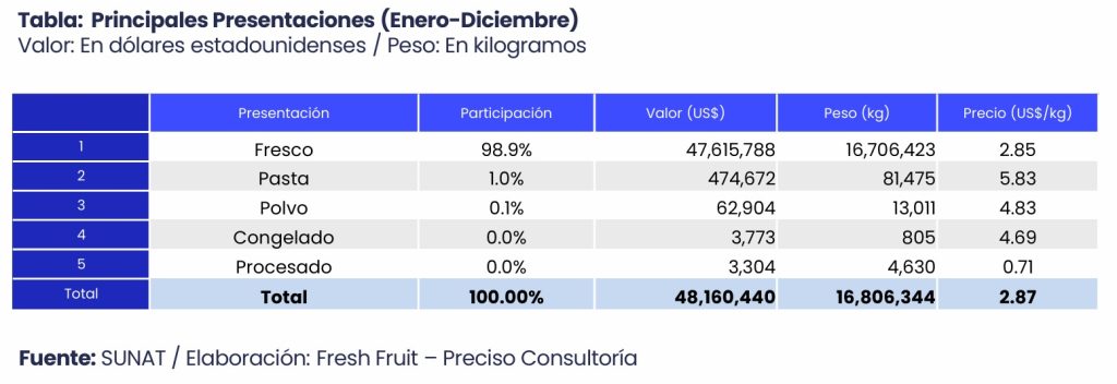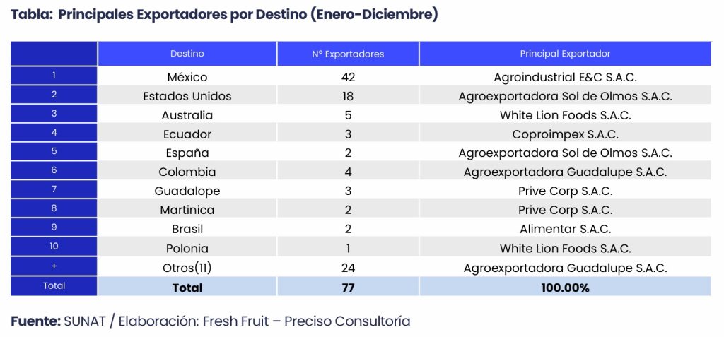 A nivel empresarial, este producto tiene un portafolio amplio de 77 empresas exportadoras, dónde, para el 2025, evidenció un cambio claro en el liderazgo respecto al 2024. Agroexportadora Sol de Olmos S.A.C., que había encabezado las exportaciones en el 2024 con US$ 8.2 millones, redujo sus envíos en el 2025 a US$ 5.4 millones (-34%). Por otro lado, Peruvian Organic Lands S.A.C. mostró el avance más relevante del grupo, al pasar de US$ 4.0 millones en el 2024 a US$ 5.5 millones en el 2025 (+38%). Agroindustrial E&C S.A.C. mantuvo un desempeño relativamente estable, con exportaciones que pasaron de US$ 6.4 millones en el 2024 a US$ 6.0 millones en el 2025 (-7%).