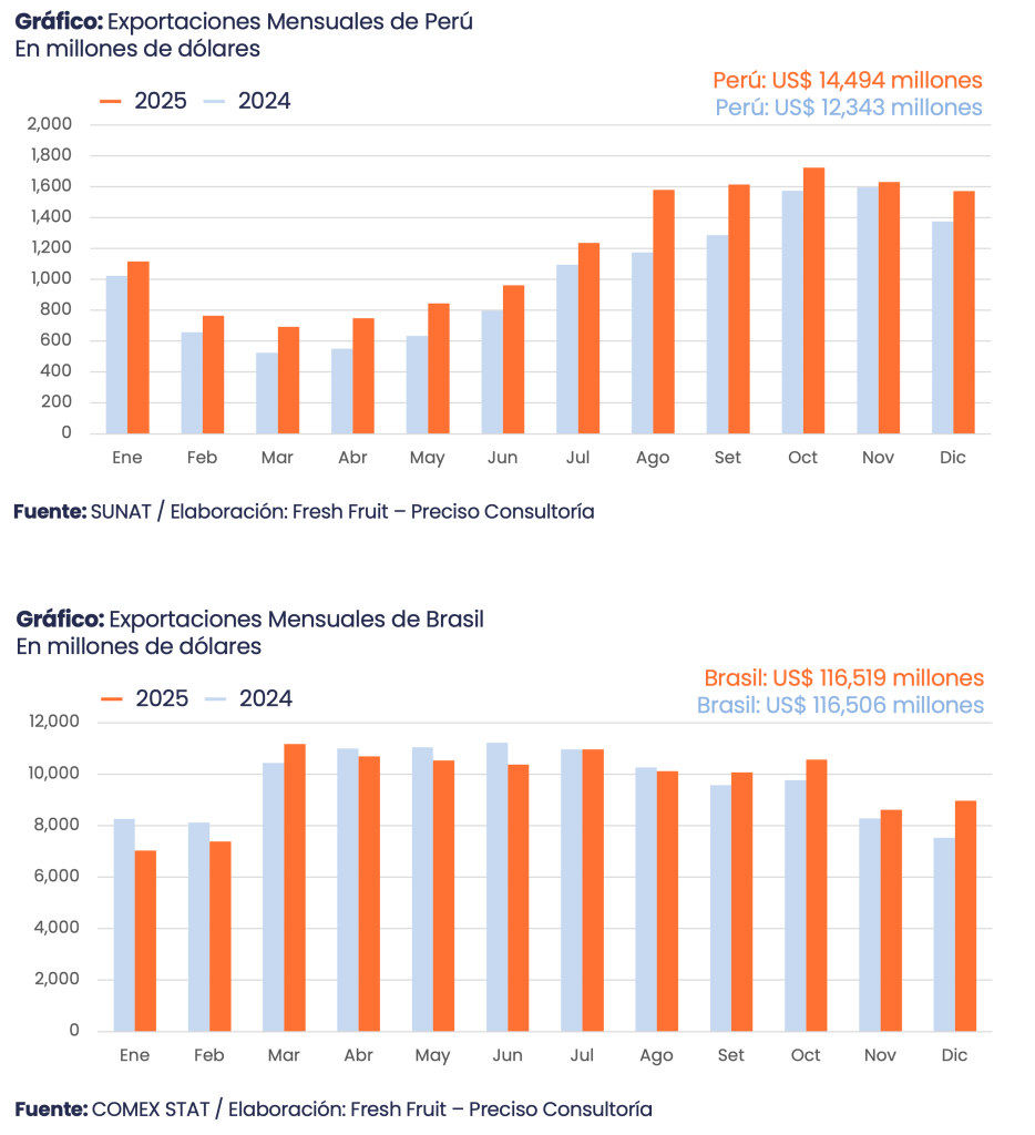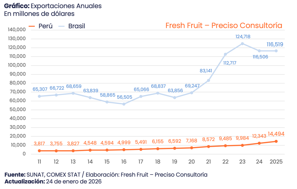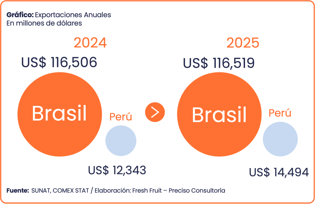 El Perú exportó US$ 14,494 millones en 2025. La diferencia con Brasil no es solo cuantitativa; es estructural. En la canasta brasileña, el resultado anual depende de pocos motores de gran tamaño (soya, café y azúcar), por lo que el desempeño está más ligado a ciclos de precio y a la capacidad de colocar volumen de manera continua. En el caso peruano, el valor se distribuye más entre productos y ventanas comerciales; la competitividad se sostiene en ejecución.