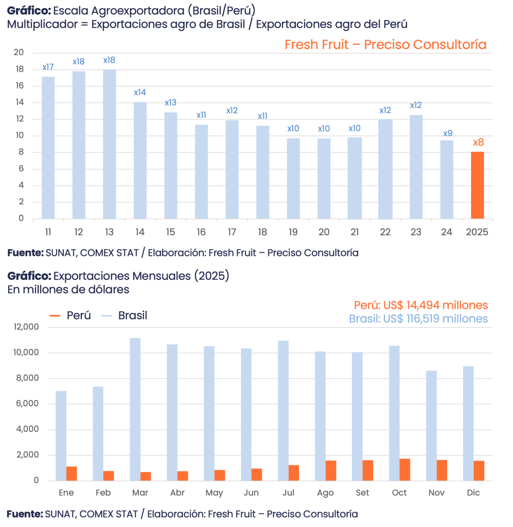 La magnitud, además, se vuelve tangible cuando se baja a ritmo: el promedio mensual brasileño ronda los US$ 9.7 mil millones. Dicho de manera simple, en un mes y medio Brasil exporta lo que el Perú en todo el año. Ese diferencial no solo refleja dotación de tierra o tamaño de mercado; también define poder de negociación, continuidad de suministro, densidad logística y capacidad de absorber shocks.