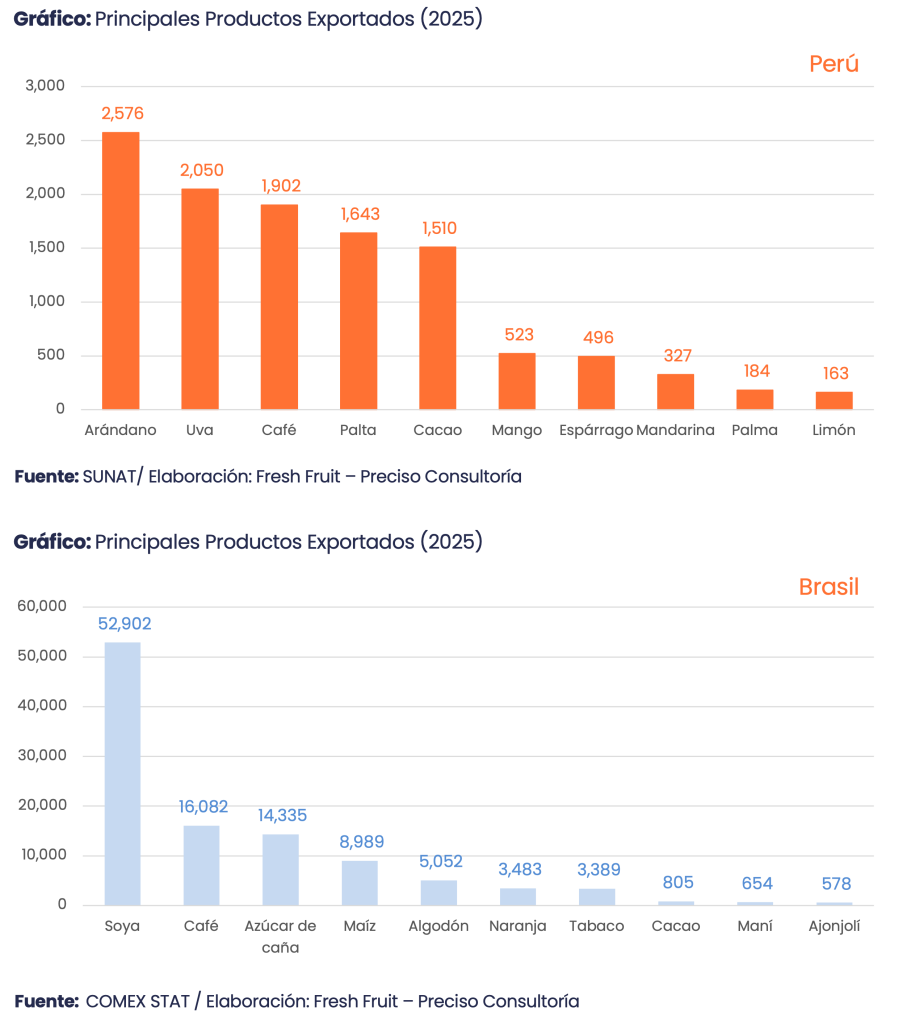 En 2025, Brasil exportó US$ 116,519 millones en productos agrícolas y el Perú, US$ 14,494 millones. La distancia no es solo de escala: es de modelo. Brasil es un gigante que opera como una plataforma de abastecimiento global, construida para mover grandes agregados con pocas palancas. El Perú compite con una canasta más diversificada y especializada: captura valor mediante especialización en alimentos saludables (café, cacao, arándano, uva y palta), ventanas comerciales y ejecución logística. Compararlos sirve menos para “medir quién gana”, dado el tamaño de Brasil, y más para entender qué tipo de economía exportadora representa cada uno.