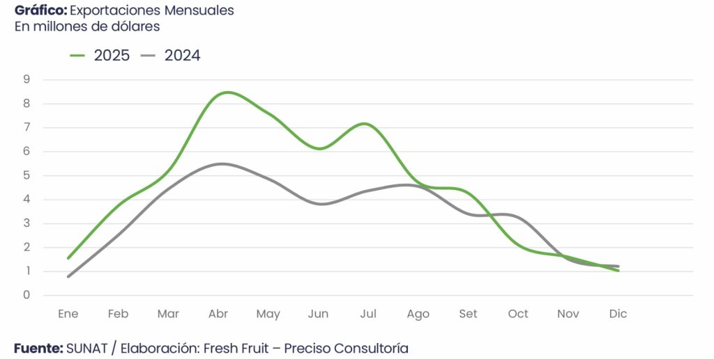 Durante el 2025, las exportaciones de nuez de Brasil mantuvieron un flujo relativamente estable a lo largo del año, con picos de valor en marzo, abril, mayo y julio, meses que superaron los US$ 7 millones en envíos. A diferencia del 2024, cuando el crecimiento estuvo más asociado al volumen, en el 2025 la dinámica exportadora se sostuvo principalmente por el incremento del precio unitario.