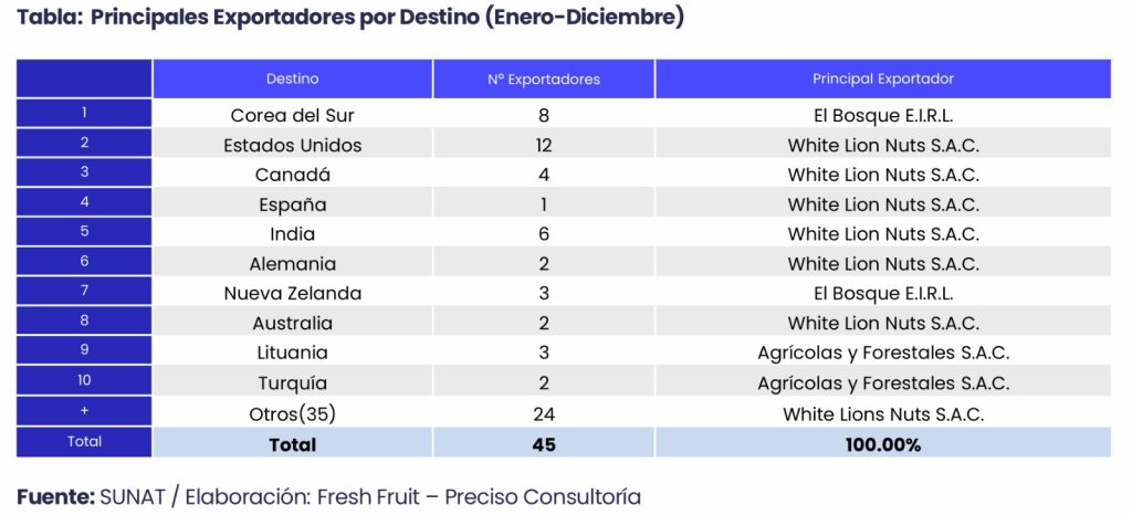 A nivel de destinos, Corea del Sur se consolidó como el principal mercado para la nuez de Brasil peruana en el 2025, concentrando US$ 11.4 millones del valor exportado, seguido por Estados Unidos (US$ 8.1 millones), Canadá (US$ 5.6 millones) y España (US$ 4.6 millones).