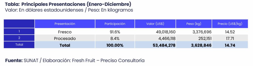El precio promedio de exportación mostró un incremento relevante, al pasar de US$ 7.36/kg en el 2024 a US$ 14.74/kg en el 2025, lo que compensó ampliamente la reducción en los embarques. Este comportamiento evidencia una mayor valorización internacional del producto, asociada a una oferta más selectiva y a una mayor participación de mercados dispuestos a pagar precios más altos.