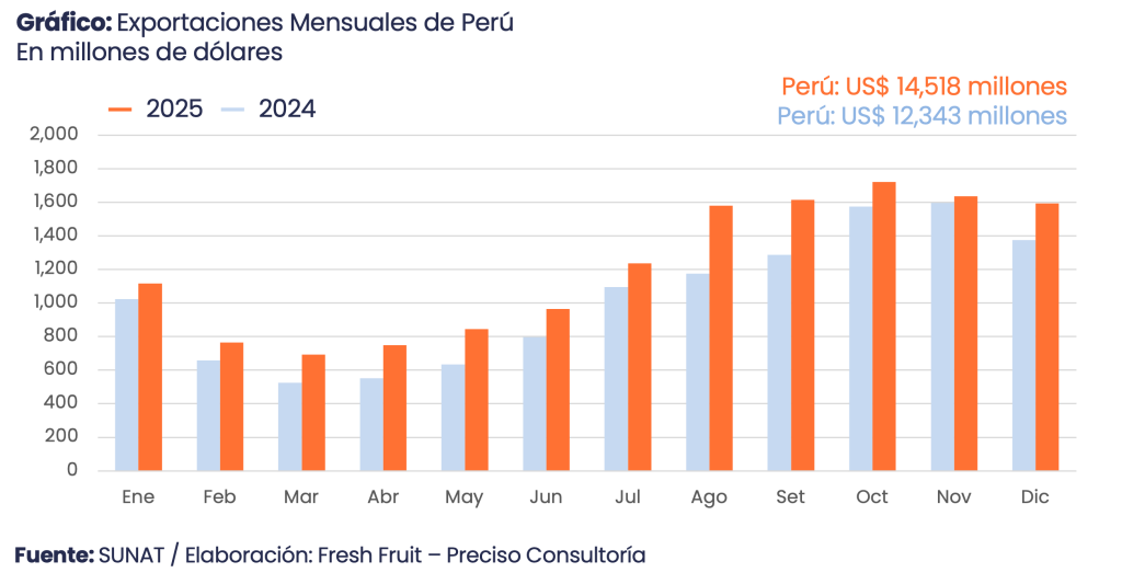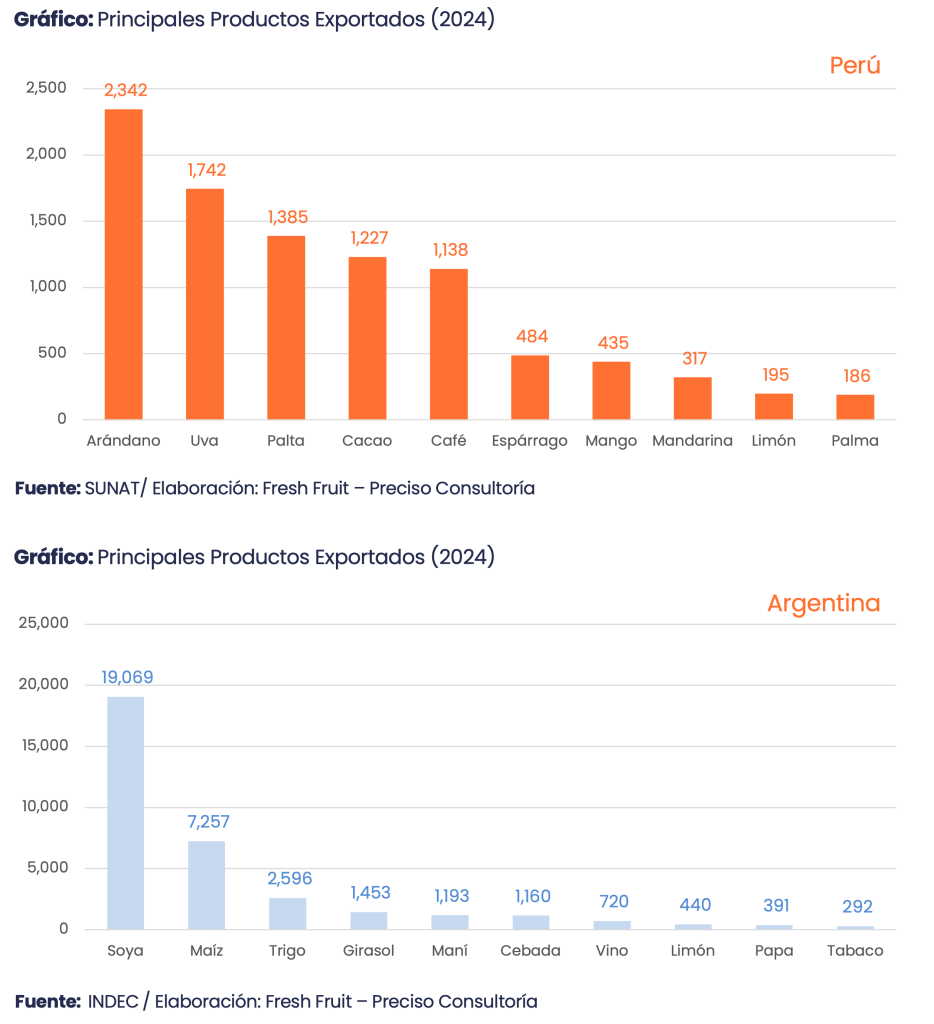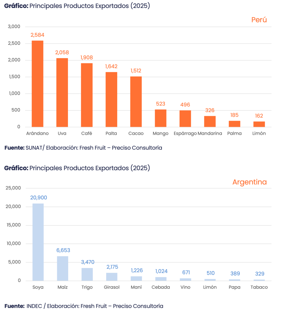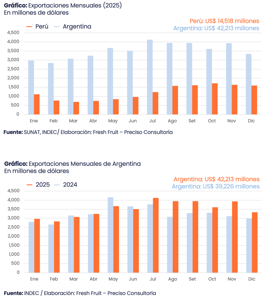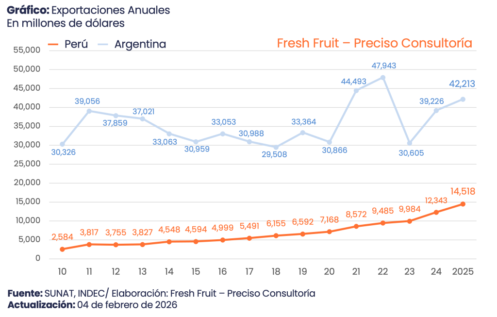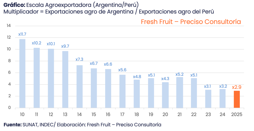 Según Fresh Fruit, en 2025 Argentina alcanzó US$ 42,213 millones en agroexportación (+7.6%) y Perú, US$ 14,518 millones (+17.6%); la relación se ajustó de 11.7x (2010) a 2.9x (2025).