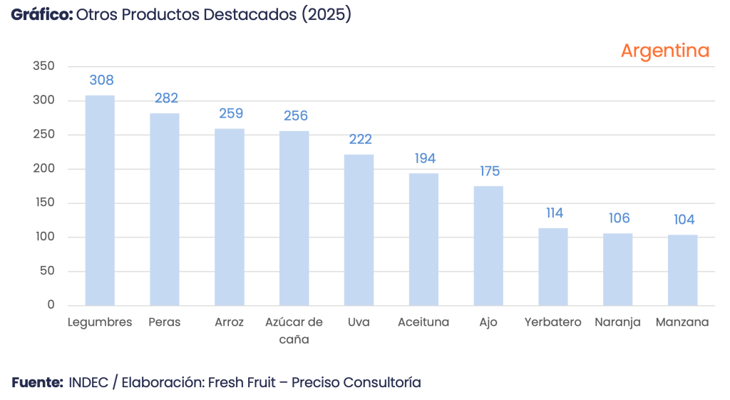 Fuera de ese grupo de productos principales, otros productos muestran avances puntuales, aunque insuficientes para alterar el agregado. El limón crece 16.0% y llega a US$ 510 millones, sosteniendo un rol relevante dentro del componente frutícola. El tabaco sube 12.8% y alcanza US$ 329 millones. Las legumbres aumentan 53.9% hasta US$ 308 millones, y el arroz crece 33.2% hasta US$ 259 millones. Sin embargo, el tamaño relativo de estas líneas sigue siendo acotado frente a los grandes productos.