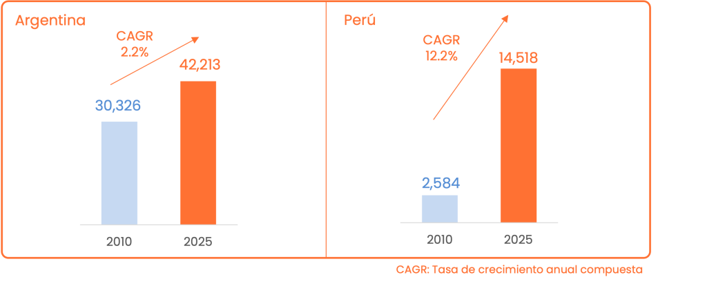 La comparación regional añade contexto. Argentina continúa siendo un exportador agroalimentario de mayor escala que Perú, pero la brecha relativa se ha comprimido de forma acelerada en los últimos quince años. En 2010, Argentina exportaba US$ 30,326 millones y Perú, US$ 2,584 millones: el tamaño argentino era 11.7 veces el peruano. En 2025, Argentina se ubica en US$ 42,213 millones y Perú en US$ 14,518 millones: el multiplicador cae a 2.9 veces. Dicho de otro modo, Perú se acerca “por ratio” porque crece a un ritmo mucho mayor, mientras Argentina preserva escala y mantiene una distancia nominal elevada. En promedio, en los últimos 15 años, la tasa de crecimiento anual de Argentina se sitúa alrededor de 2.2%, mientras la de Perú bordea 12.2%.