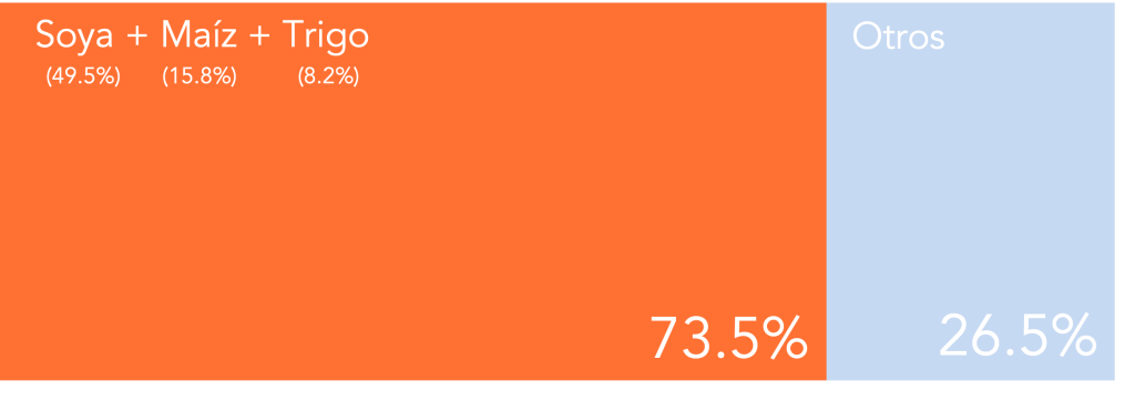 El aumento de 2025 se explica por un reacomodo dentro del núcleo, más que por una mejora generalizada de toda la canasta. La soya, que ya domina el portafolio, crece 9.6% anual y suma US$ 1,831 millones, alcanzando US$ 20,900 millones y representando 49.5% del total. El trigo registra un salto de 33.7%, añade US$ 875 millones y llega a US$ 3,470 millones. El girasol crece 49.6%, aporta US$ 721 millones y escala a US$ 2,175 millones. Estas tres líneas explican la mayor parte del avance anual.