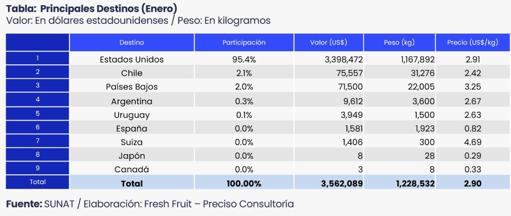 En cuanto a los mercados de destino, Estados Unidos se consolidó como el principal comprador, concentrando el 95% del valor total exportado. Los envíos hacia este mercado sumaron US$ 3.4 millones, equivalentes a 1,168 toneladas, con un precio promedio de US$ 2.91 por kilogramo, en línea con el promedio general.