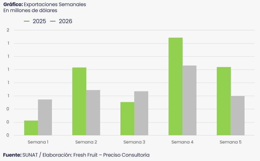 No obstante, el precio promedio se ubicó en US$ 2.90 por kilogramo, ligeramente por encima de los US$ 2.86 por kilogramo registrados en enero del 2025, reflejando un incremento leve de 1%; pese a ello, esta mejora no fue suficiente para contrarrestar la caída en el volumen exportado, lo que finalmente se tradujo en un menor valor total de los envíos.
