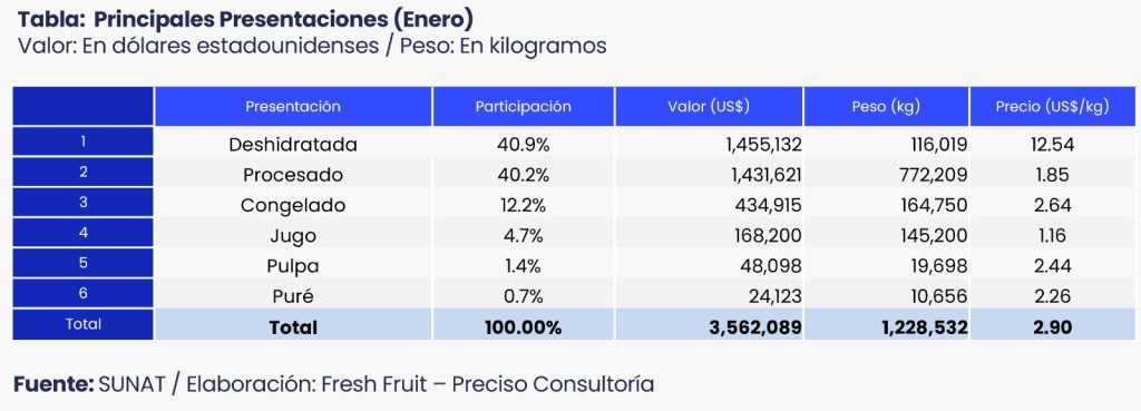 El tercer puesto lo ocupó Agroindustrias JAS E.I.R.L., con US$ 168 mil y una participación de 5%, registrando un precio promedio de US$ 1.16 por kilogramo. En conjunto, estas tres empresas concentraron alrededor del 80% del valor total exportado, reflejando un alto grado de concentración en los principales actores del sector durante el primer mes del año.