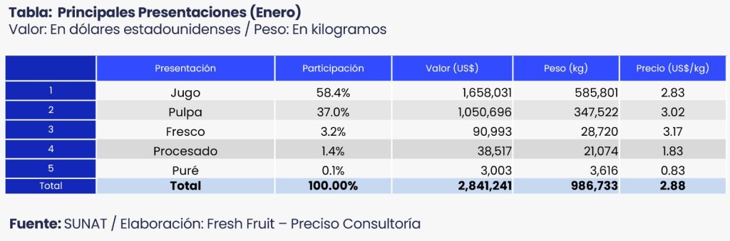Respecto a las presentaciones, el jugo de maracuyá fue la principal forma de exportación durante enero del 2026, concentrando el 58% del total enviado, con despachos por US$ 1.7 millones y un precio promedio de US$ 2.83 por kilogramo. Le siguió la pulpa, que representó el 37%, alcanzando los US$ 1.0 millones, con un precio promedio de US$ 3.02 por kilogramo. En menor medida, el maracuyá fresco y procesado complementaron la canasta exportadora, con participaciones de US$ 90 mil y US$ 38 mil, respectivamente.